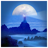 Description: Tiny faraway lighthouse and behind it the rising moon.